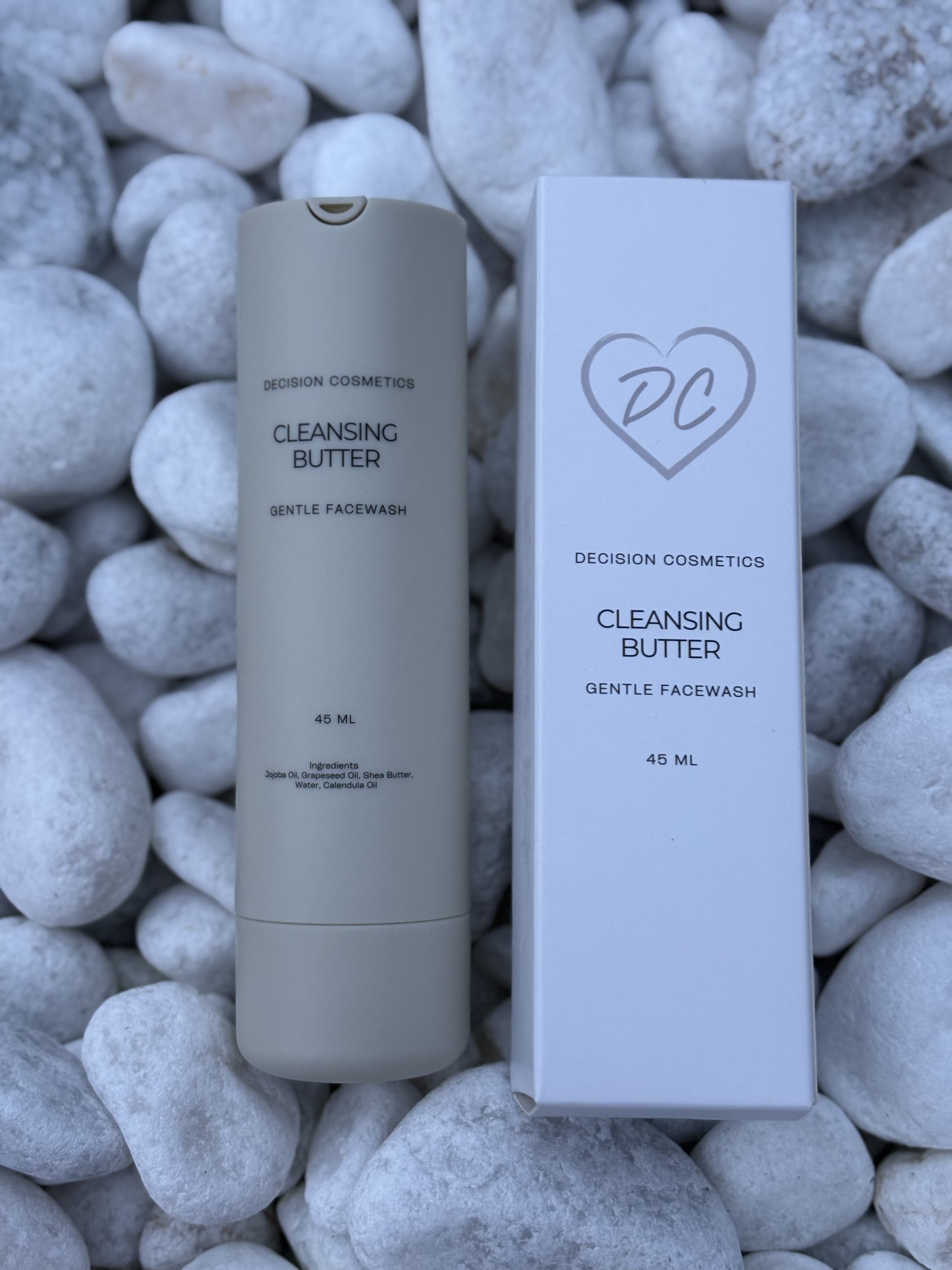 Our Cleansing Butter is a gentle cleanser and moisturiser in one, for your face. It contains 5 ingredients: Jojoba Oil, Water, Grapeseed Oil, Shea Butter and Calendula Oil.